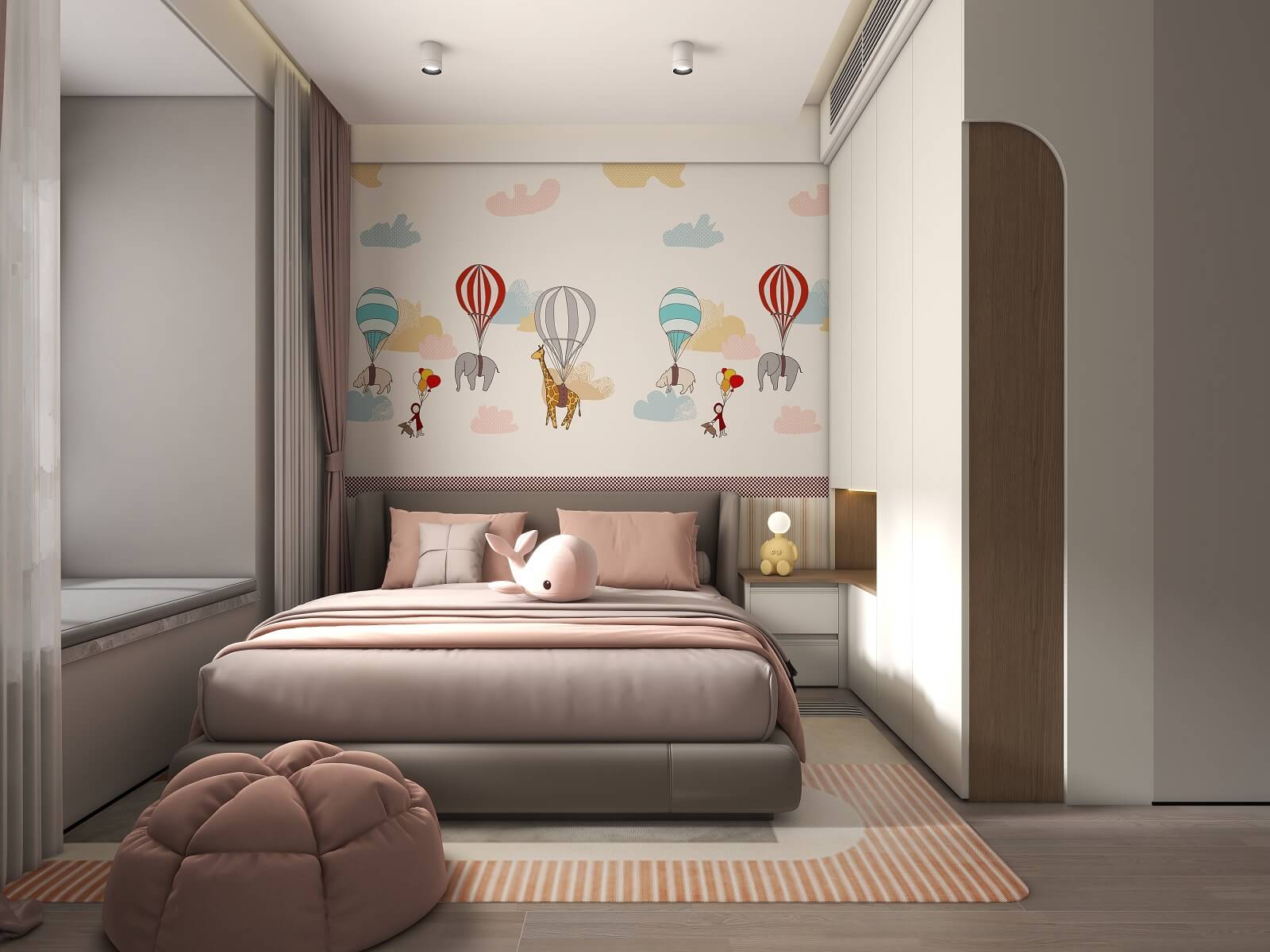 儿童房采用温柔的奶白作为空间底色,整墙卡通贴画搭配奶油白衣柜,在细节上用粉色装饰作为跳色,无形中增加立体感和层次感,营造出童真舒适的儿童梦中情房。